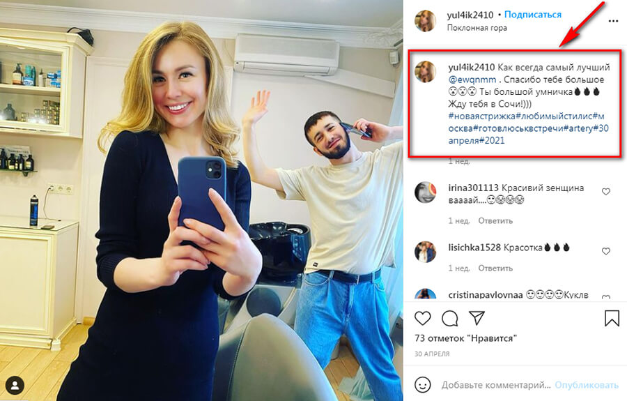 Это контент, созданный вашими клиентами. Простой пример — ваша клиентка сделала себе модную стрижку и, конечно же, захотела похвастаться в Инстаграм. Если она просто выложит фото или пост без упоминания вашего салона, никто не узнает, где ее так хорошо постригли, пока не спросят напрямую.