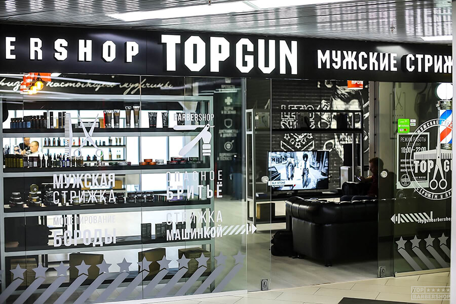 Хороший пример правильного подхода к дизайну заведения — сеть барбершопов Topgun. У компании узнаваемая вывеска и своя особая мужская атмосфера в помещениях.