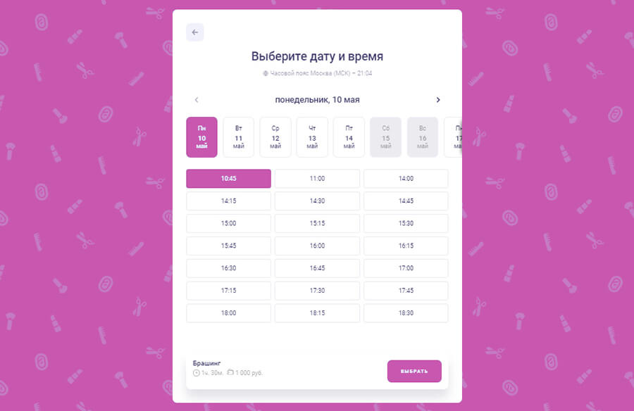 Советуем поставить на сайт виджет онлайн-записи EasyWeek. Он будет автоматически записывать клиентов за вас в круглосуточном режиме. Пользователю нужно будет только выбрать адрес заведения, услугу, мастера, дату и время визита, а также подтвердить запись. Это удобно, так как клиент может записаться даже в нерабочее время, и ему не нужно тратить время на звонки. Запись автоматически заносится в электронный журнал, а клиенты и мастера получают уведомления.