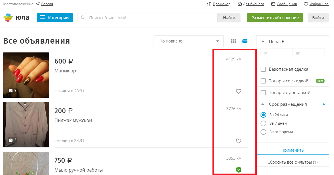 На главной странице пользователи «Юлы» видят объявления, которые соответствуют их интересам и геолокации. При этом в любой момент можно указать интересующий город или регион вручную, а «Юла» рядом с каждым объявлением покажет в километрах расстояние от вас до продавца.