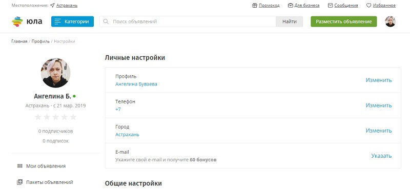Если вы планируете размещать на «Юле» объявления от лица компании, заполните профиль правильно. Кликните на свою аватарку в правом верхнем углу интерфейса и выберите во всплывающем меню пункт «Настройки».