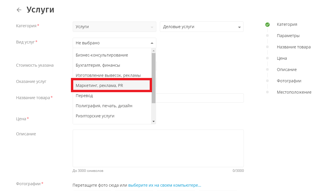 Категория. В разделе «Вид услуг» выберите пункт «Маркетинг, реклама, PR».