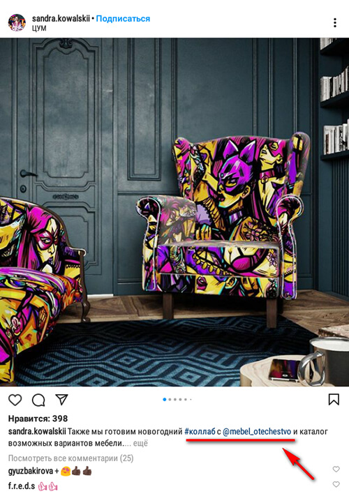 Пример — коллаборация художника с производителем мебели. Дизайнер-художник привлекла внимание к своему творчеству, а производитель получил клиентов, которые заинтересовались мебелью с необычным дизайном.