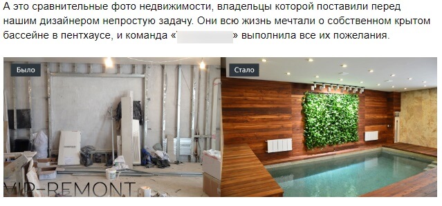 Продолжая пример с ремонтом: тут хорошо сработают фото «до/после»: