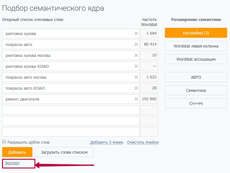 После того, как вы расширили опорный список семантики, его нужно почистить от «мусора» — специальных символов, знаков препинания, дублей, табуляции и пробелов. Выгрузите собранное ядро с помощью функции «Экспорт»: