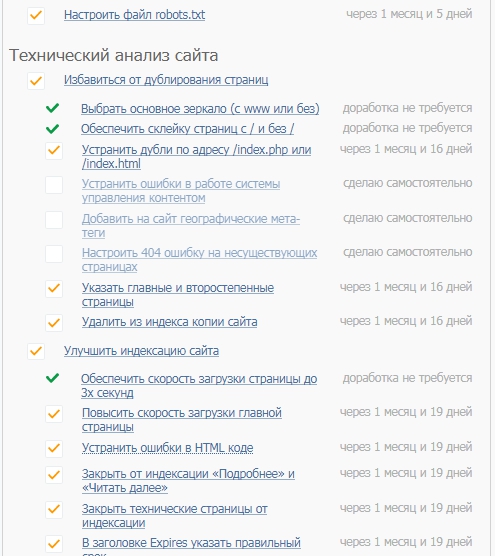 - Также в модуле «Оптимизация сайта» отображается полный список работ, которые нужно выполнить по сайту. Список оформлен в виде чек-листа, в котором вы можете снять галочки с тех работ, которые вы будете выполнять сами или силами штатных специалистов. Остальные работы выполнят сотрудники PromoPult.