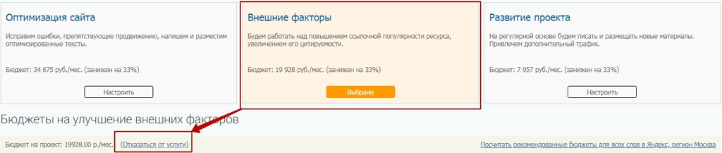 - Установить бюджет для каждого из трех модулей по отдельности — например, оставить рекомендованный системой бюджет для работ по оптимизации, а для модуля «Развитие проекта» увеличить или снизить.