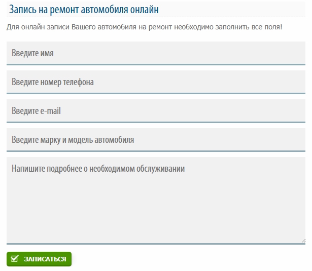 - Форма для заявок. Онлайн-запись — удобно для тех, кто не хочет искать номер телефона сервиса и звонить самостоятельно.