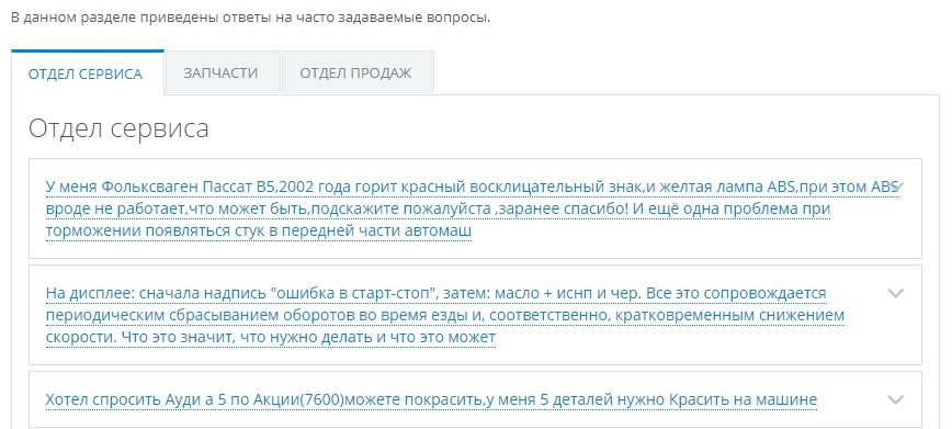- Раздел FAQ (с частыми вопросами и ответами). Для автосервиса с большим потоком клиентов такой раздел поможет разгрузить менеджеров по продажам и дать клиентам ответы на базовые вопросы.