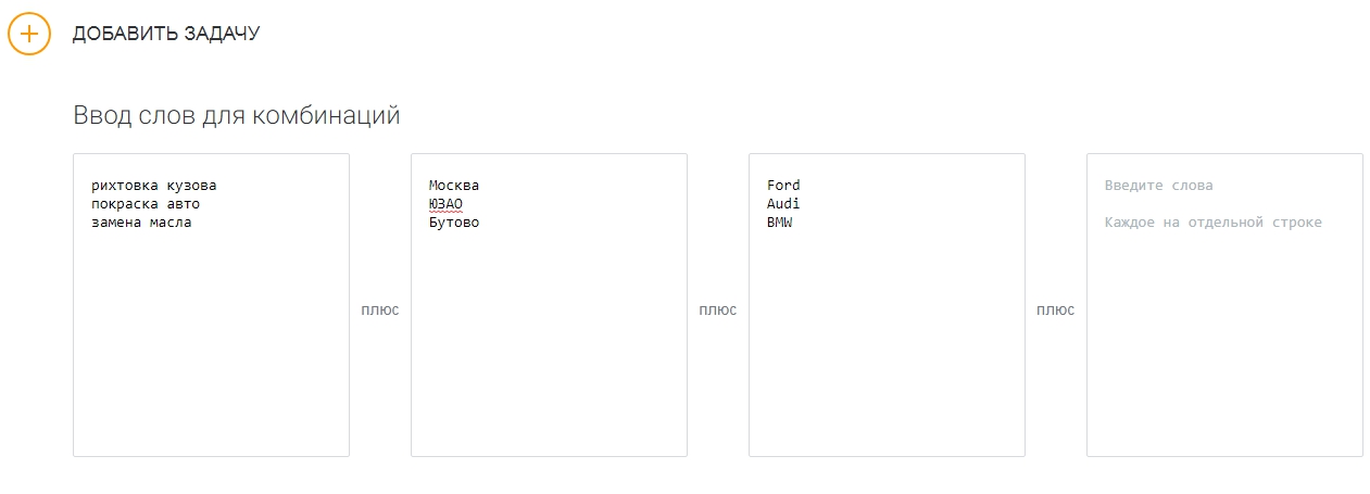 Перейдите в Комбинатор слов (бесплатный инструмент от PromoPult). Здесь нужно перемножить фразы, подготовленные на предыдущем этапе. Перемножать будем в два этапа, используя три столбца для указания ключевых фраз.