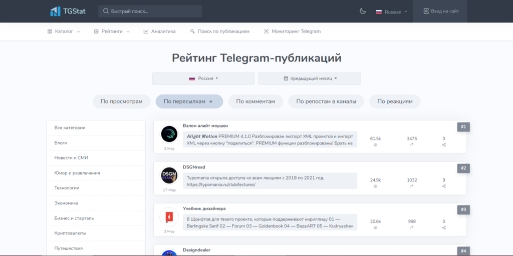 Наиболее популярные – TGStat, Telegros, Tlgrm. В них каналы распределены по рейтингу и темам.