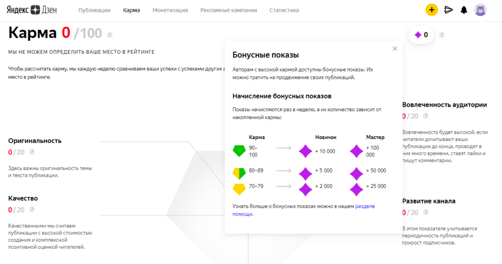 Карма — инструмент Яндекс.Дзена, который оценивает качество канала по пяти параметрам.