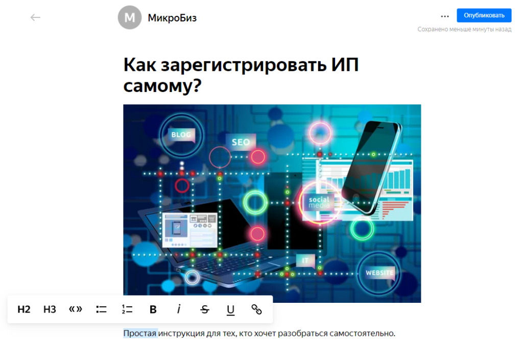 У Яндекс.Дзена простой и лаконичный визуальный редактор. Поэтому размещение публикации не занимает много времени.