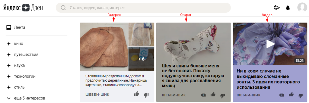 Допустим, вы ведете блог о рукоделии и канал на Яндекс.Дзене примерно на ту же тему, но публикуете там разные материалы. Блог существует давно и имеет стабильный трафик, а канал создан недавно и только начинает набирать показы. Вы можете добавить на страницы статей виджет, в котором будут автоматически отображаться превью нескольких публикаций с канала.