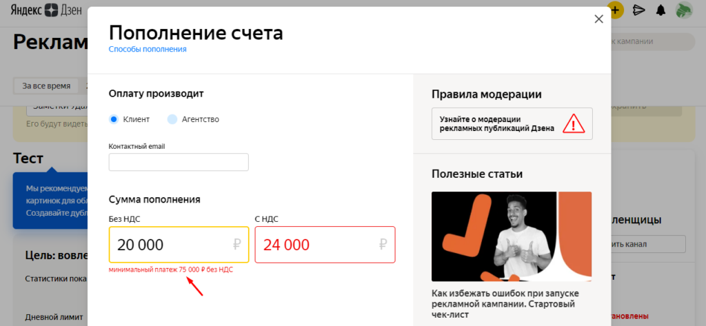 Поговорим о платном продвижении в Яндекс.Дзене. Это не самый популярный метод для новых каналов, так как требует вложений (минимальная сумма пополнения рекламного кабинета — 75 000 руб.).
