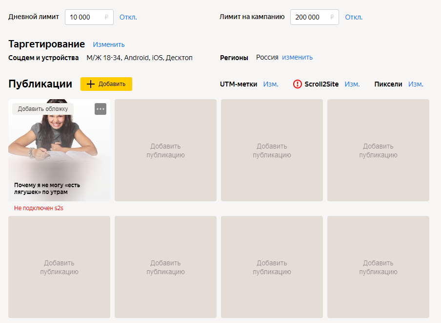 Дзен рекомендует добавлять по 3–5 разных заголовков и обложек к каждой рекламируемой публикации и использовать их в разных сочетаниях между собой. Так вы протестируете и найдете варианты, которые работают лучше всего.