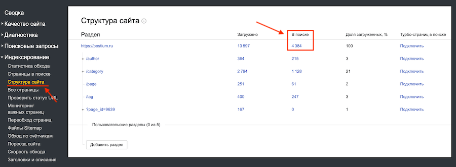 Заходим в Яндекс.Вебмастер и переходим «Индексирование — Структура сайта». Напротив своего сайта, в столбце «В поиске» вы увидите количество проиндексированных страниц.