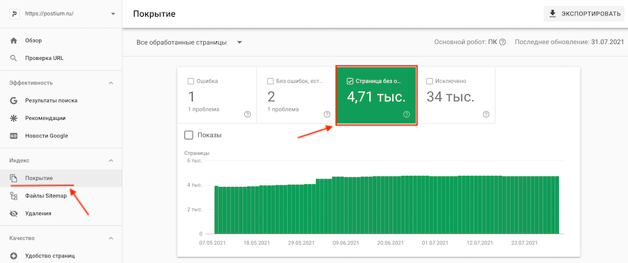 Заходим в Search Console и открываем раздел «Покрытие». Здесь также показывается количество проиндексированных страниц, и страницы с ошибками.