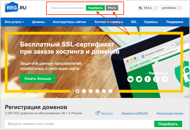 Для этого заходите на сайт reg.ru. В самом верху на главной странице вы увидите 2 инструмента: