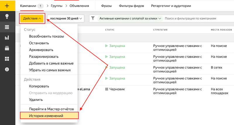 Кроме того, вы истории изменений, вы можете видеть, когда были внесены изменения, кем (если аккаунт находится под управлением нескольких менеджеров), в какие кампании и объявления, а также какие параметры были изменены.