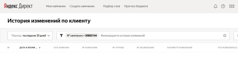 История изменений в Яндекс.Директ — это список всех изменений в аккаунте или рекламной кампании. Автоматические остановки и запуски кампаний из-за ограничения дневного бюджета или нехватки денег не попадают в историю изменений.