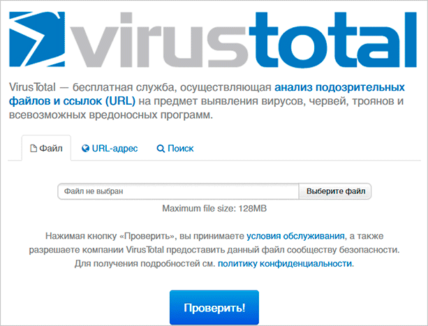 Наш любимый сервис. VirusTotal очень удобен, есть поддержка русского языка. Сама проверка здесь реализована с помощью большого количества известных антивирусных приложений.