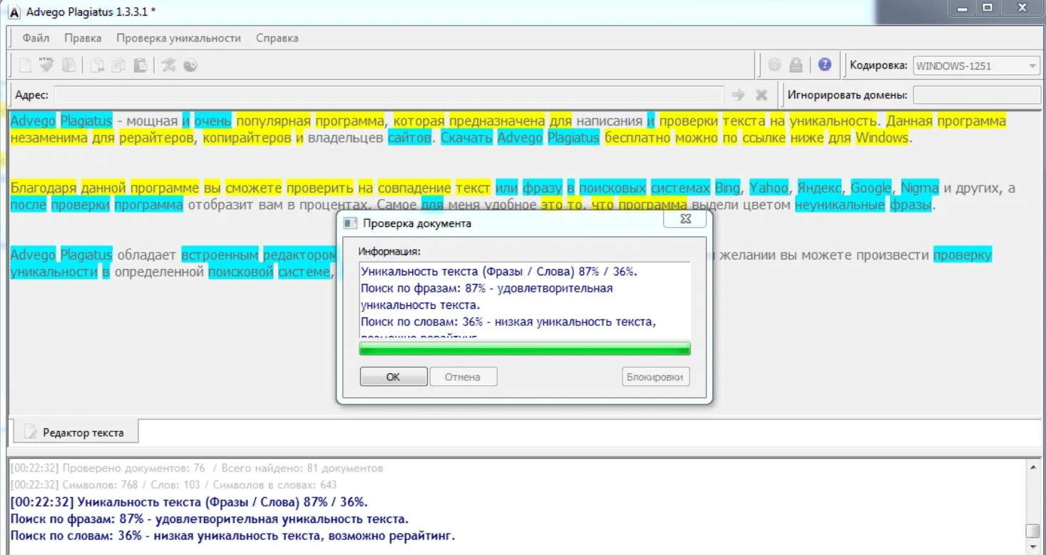 Advego Plagiatus – одна из распространенных программ. Она скачивается на компьютер бесплатно с официального сайта и может производить быструю и глубокую проверку. Быстрая проверка показывает уровень копипаста. Глубокий анализ текста подсвечивает фрагменты некачественного рерайта и плагиата.