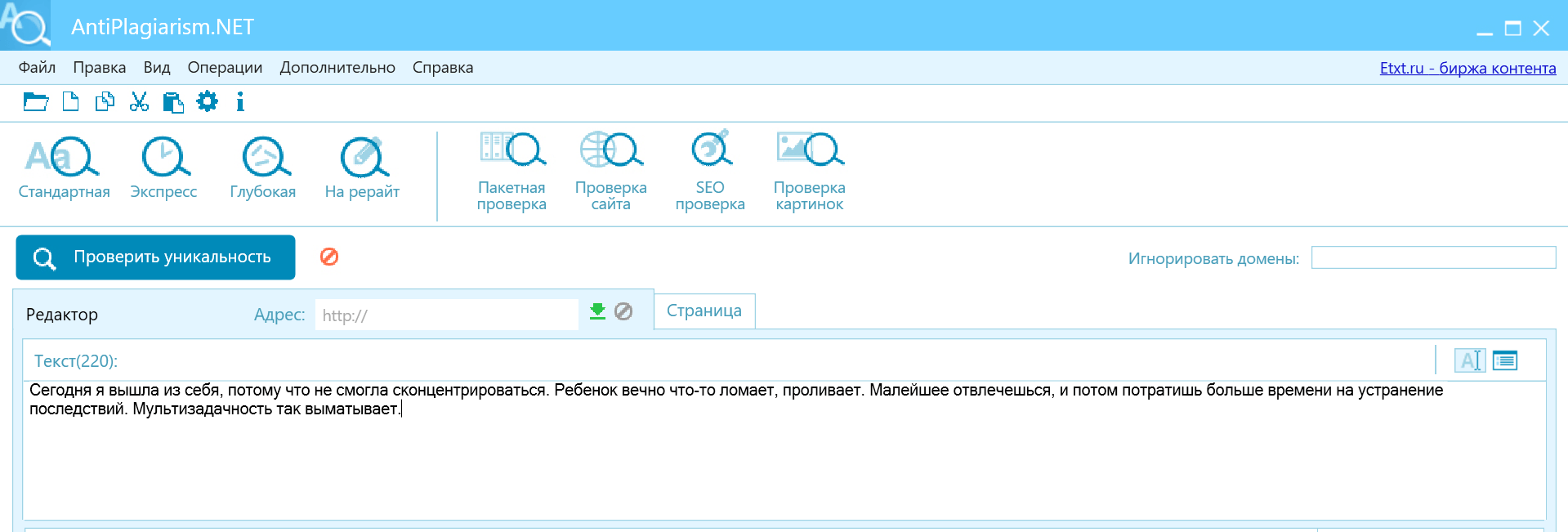 В этом случае рекомендуем установить программы на компьютер. Можно установить Advego Plagiatus и eTXT Антиплагиат. Они неоднократно запрашивают капчу, из-за чего проверка затягивается. Но зато платить не нужно и ограничений по размеру нет.