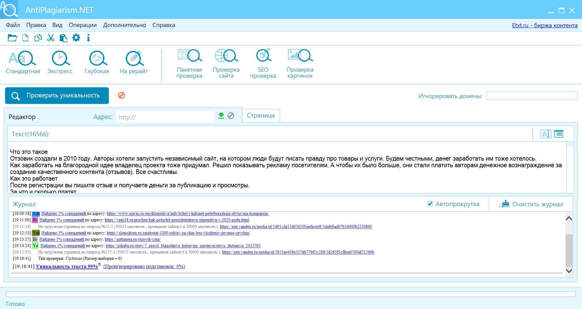 Анализ статьи размером 16 556 знаков занял у меня примерно 6 минут. Стандартная проверка оценила уровень уникальности в 100 %, глубокая – 99 %. Совпадения подсветились разными цветами.
