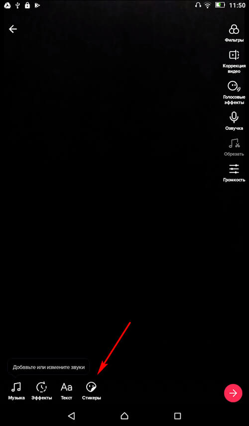 Шаг 1. Открываем Тик-Ток, создаем видео привычным способом — записываем на камеру смартфона или загружаем заранее созданное с галереи. На этапе редактирования, где добавляются эффекты, музыка, фильтры находим инструмент «Стикеры». В нижней части экрана. Кликаем на него.