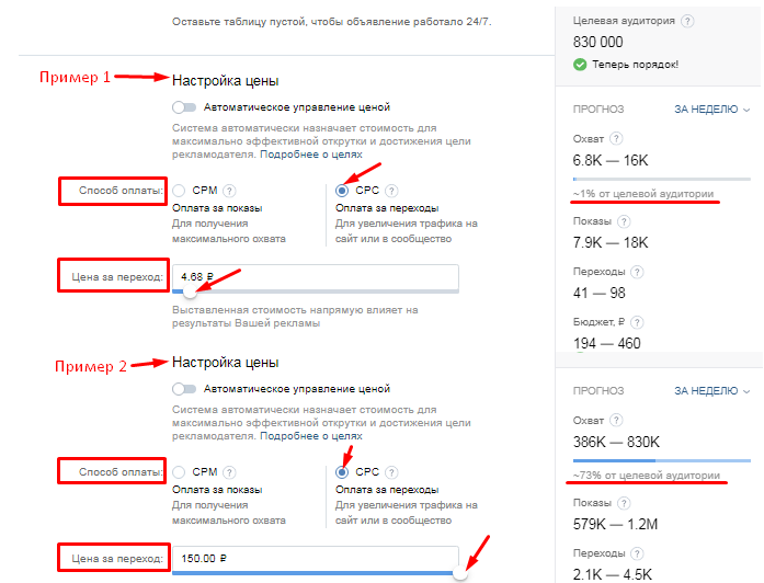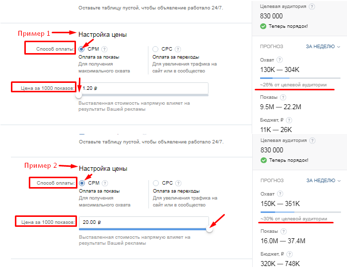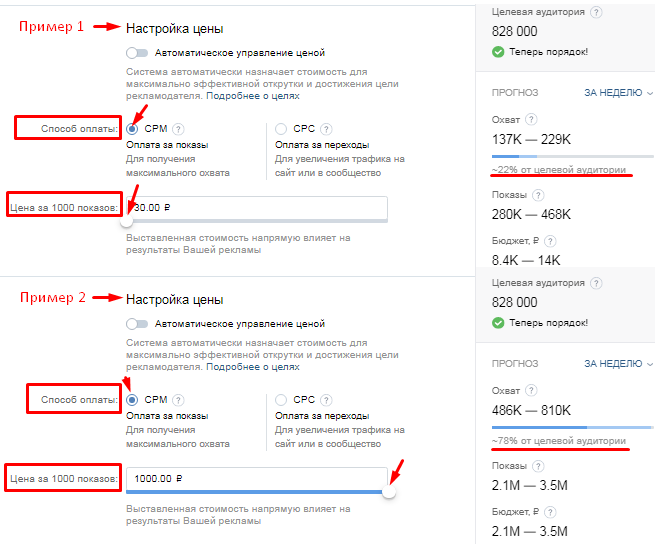 На примере рассмотрим, как изменится охват аудитории при установлении ставки на минимально и максимально допустимом уровне.