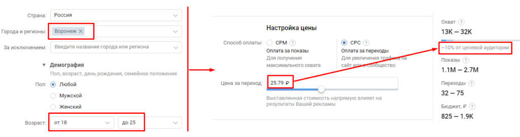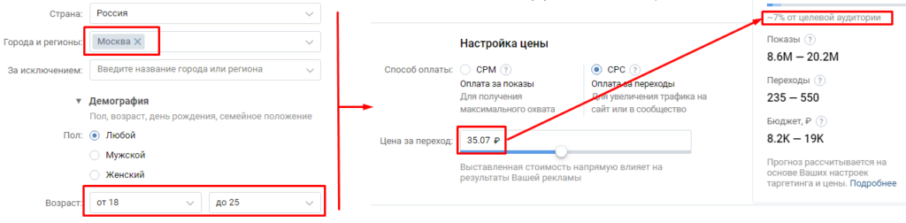Обратите внимание, что на рекомендованную ставку и охват при модели CPC влияют практически все параметры таргетинга. Например, если мы таргетируемся на жителей Москвы в возрасте от 18 до 25 лет, рекомендованная ставка составит 35,07 руб. при охвате 7%.