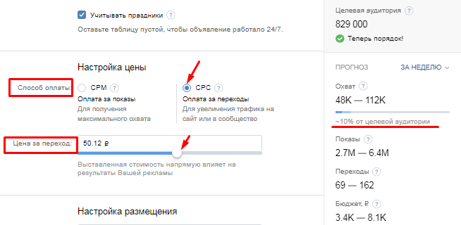После выбора модели оплаты рекомендованная ставка — 50,12 руб. Охват — 10% от целевой аудитории.