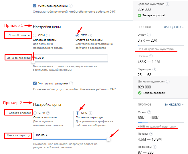 Аукционы ВКонтакте проводятся только за просмотры (CPM). Но как быть с моделью оплаты за клики? Для того чтобы сделать рекламный аукцион ВКонтакте справедливым, все ставки приводятся к единому показателю.