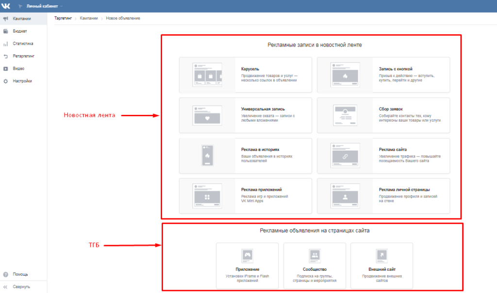 Выбор рекламного формата — первый шаг настройки таргетированной рекламы. Для объявлений в ленте и в ТГБ проводятся разные аукционы.