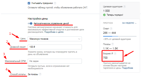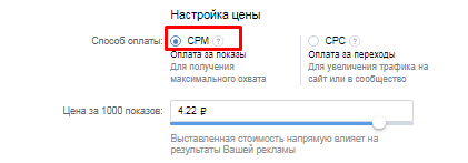 Рекламодатель выбирает способ оплаты (CPM или CPC) и самостоятельно назначает ставку. Система рассчитывает охват аудитории, количество показов и бюджет исходя из настроек таргетинга и установленной ставки.