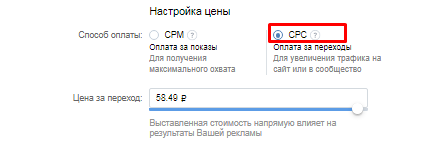 Если вы выбрали модель закупки рекламы CPC, то стоимость перехода будет обратно пропорциональна CTR объявления: чем ниже CTR, тем выше CPC (стоимость перехода).