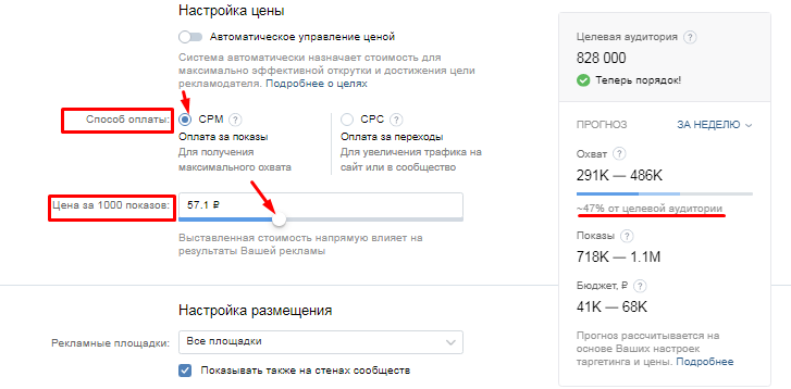 В примере выше рекомендованная ставка за 1000 показов составляет 57,1 руб. При такой ставке охват составит 47% целевой аудитории.