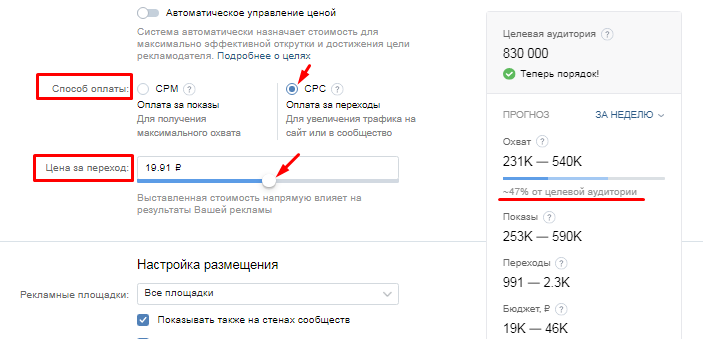 После выбора модели оплаты система установила рекомендованную ставку на уровне 19,91 руб. за переход. Охват аудитории — 47%.