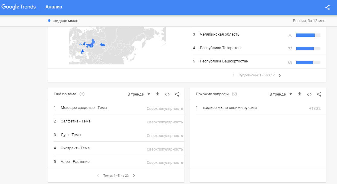 Например, для запроса «жидкое мыло» самой популярной считается тема «моющее средство», затем запрос пересекается с темой салфетки, душа, экстракта и растением алоэ. Эти данные мы видим в настройке «По трендам», также имеется вкладка «Лидеры» – её тоже следует изучить. Структура похожих запросов аналогичная. Только здесь указаны именно дополнительные запросы, а не темы.