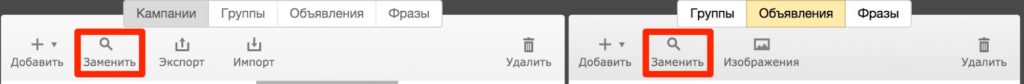 Рассмотрим ее на уровне кампаний, групп и отдельных объявлений — вы легко найдете значок «Заменить» в верхнем тулбаре соответствующих вкладок.