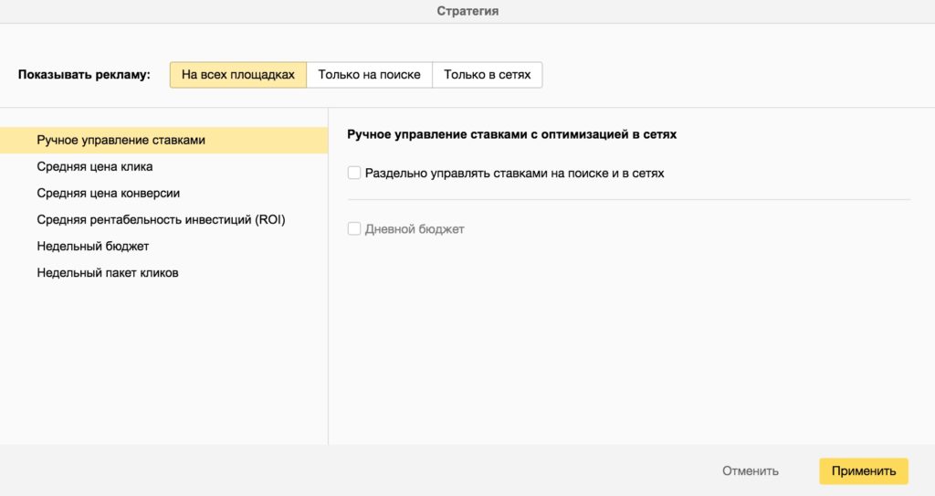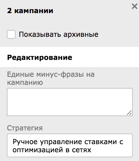 Если вы пользуетесь интеллектуальными стратегиями назначения ставок, их можно одновременно включать или изменять для ряда кампаний. Выделите все необходимые кампании на левой панели и кликните на поле «Стратегия» в инспекторе.