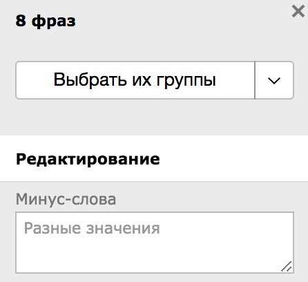 Будьте внимательны! Если в поле написано «Разные значения», как на скриншоте, все существующие минус-слова выбранных ключей будут стерты. Если вы уже случайно их удалили, просто нажмите Ctrl+Z или Cmd+Z для отмены изменений.