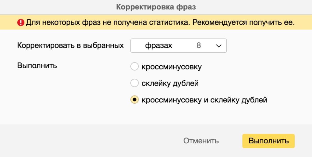 Напоследок еще одна полезная функция Директ Коммандера, уже не задействующая инспектор. Речь о кросс-минусовке и склейке дублей – инструментах, автоматически устраняющих в семантике пересечения и повторы.