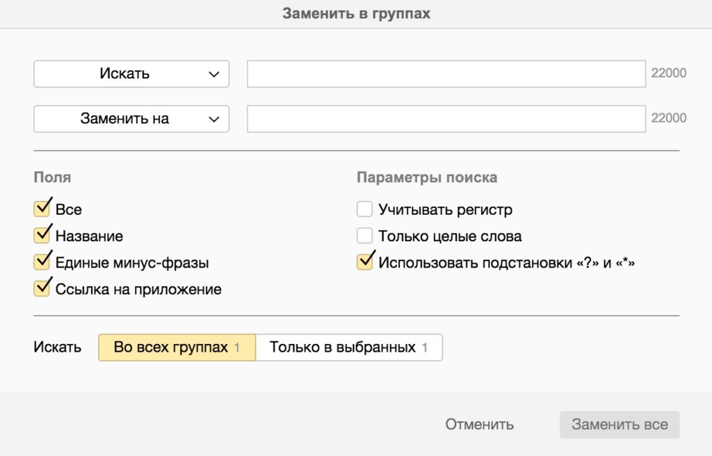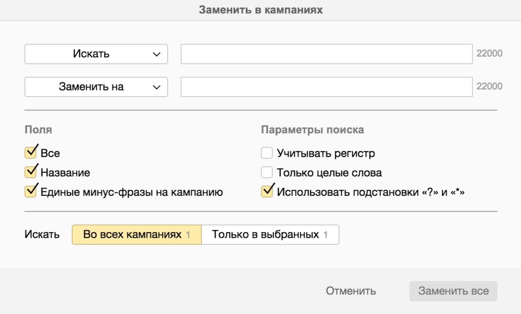 На этом уровне опций меньше всего: нечасто приходится редактировать названия целого ряда кампаний. Однако вы можете воспользоваться заменой единых минус-слов, если хотите их уточнить или если в семантику вкралась опечатка.