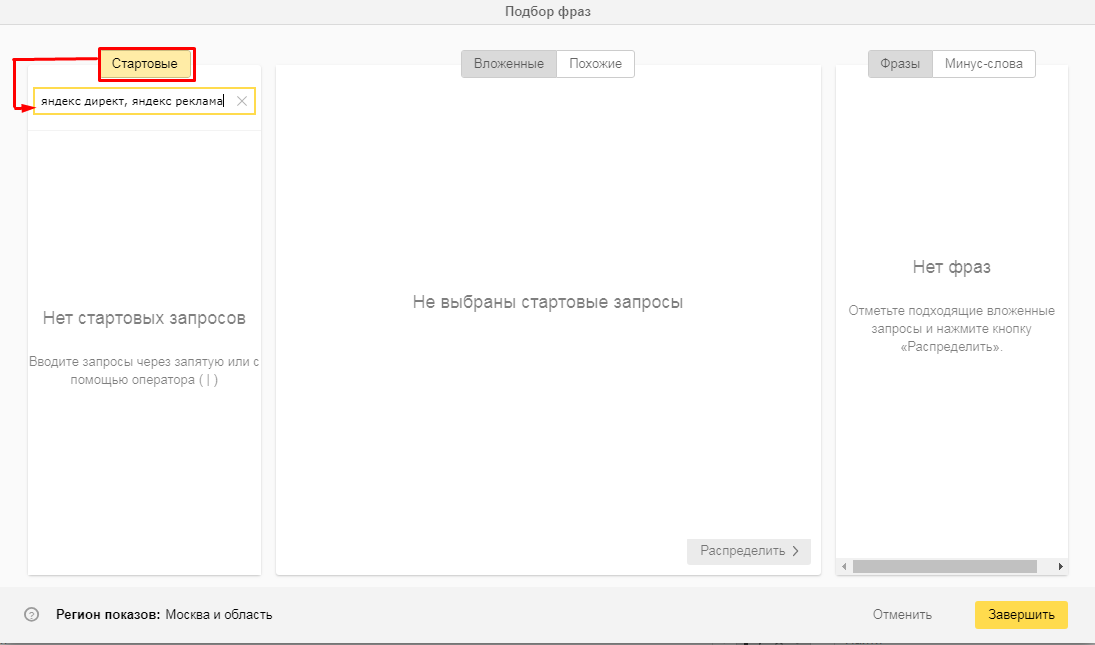 Откроется окно подборщика фраз. Введите опорные фразы через запятую.