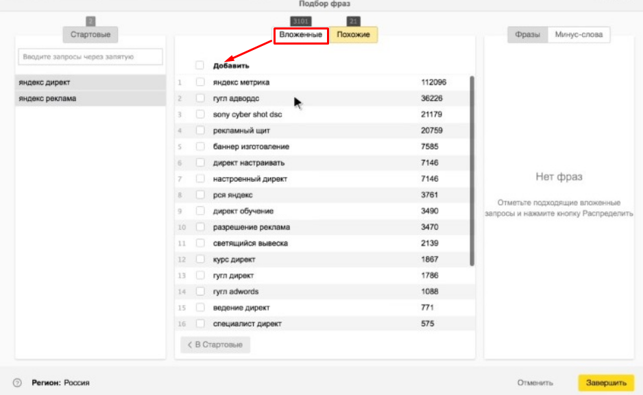 Система сама подберет фразы и выведет их на центральной панели на вкладке «Вложенные».