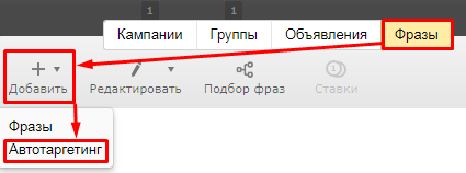 Для настройки автотаргетинга откройте вкладку «Фразы». На панели инструментов кликните «Добавить». В открывшемся меню выберите «Автотаргетинг».