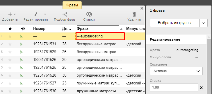 В столбце «Фраза» вы увидите запись «autotargeting».