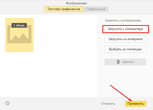 Далее выберите способ загрузки изображения: его можно загрузить с компьютера, из интернета и из коллекции. Нажмите кнопку «Применить».